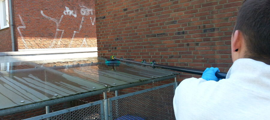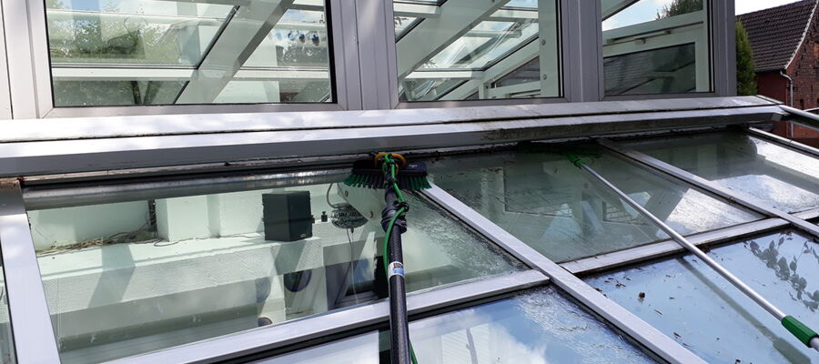 Wasserführende Teleskopstangen mit einem auf den jeweiligen Einsatz abgestimmten Bürst-System, machen waghalsige Kletteraktionen auf Ihrem Glasdach unnötig. Die Gesundheit und Unversehrtheit unserer Mitarbeiter ist nämlich ein sehr hohes Gut für uns! Ganz abgesehen davon, das ein Unfall, der dadurch verursacht wurde, dass ein Mitarbeiter zu Reinigungszwecken ein Glasdach betreten hat, in keinem Fall versichert.